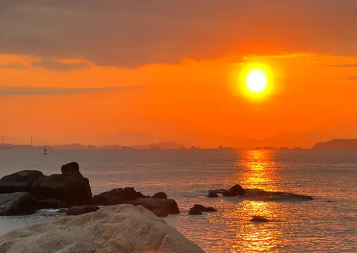 With fine sand and gentle currents, Huangcuo Beach is one of the most suitable beaches for swimming in Xiamen. The sea water is quite clear with transparency exceeding 5 meters and 36 species inhabiting the intertidal zone, so snorkeling to observe the sea animals has been one of the most popular things to do in Xiamen. At 05:00 in the morning, you can watch the sun rise above the horizon, with pink and purple rosy clouds filling the sky.