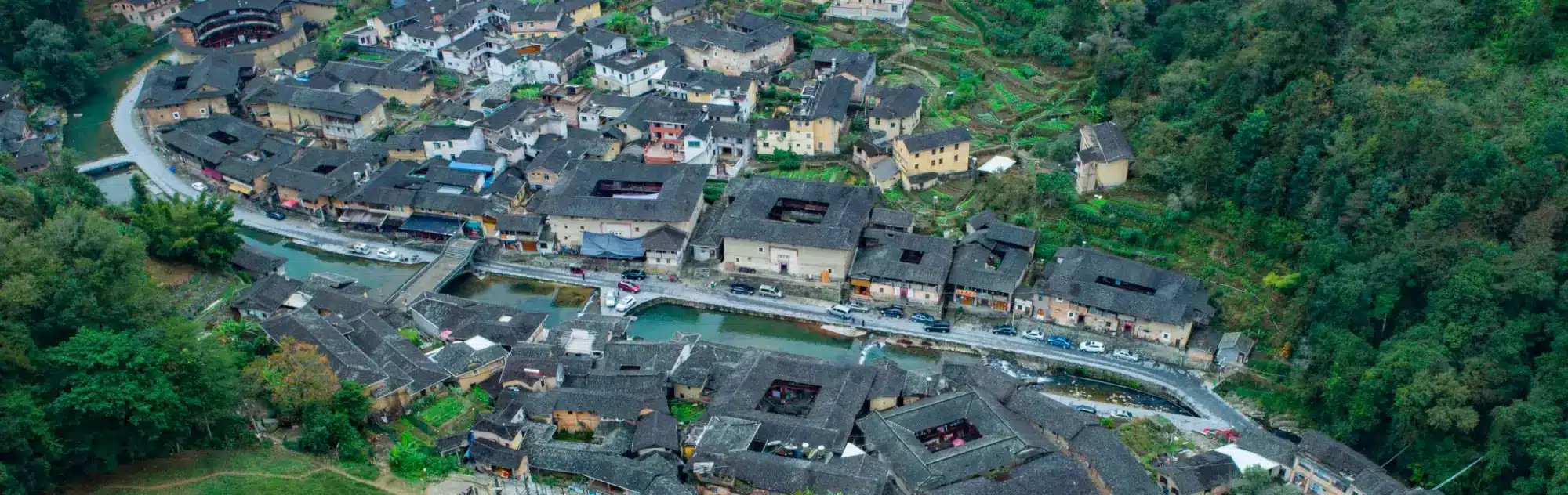 A small stream in the village flows from one end of the village to the other end of the village, in an S-shape, which is like the eyes of Yin and Yang fish in Taiji, creating a classic Chinese Taichi Village. The village is dotted with 45 round or square Fujian Tulou of different sizes, with Yude Tulou and Shunchang Tulou as the most famous.
