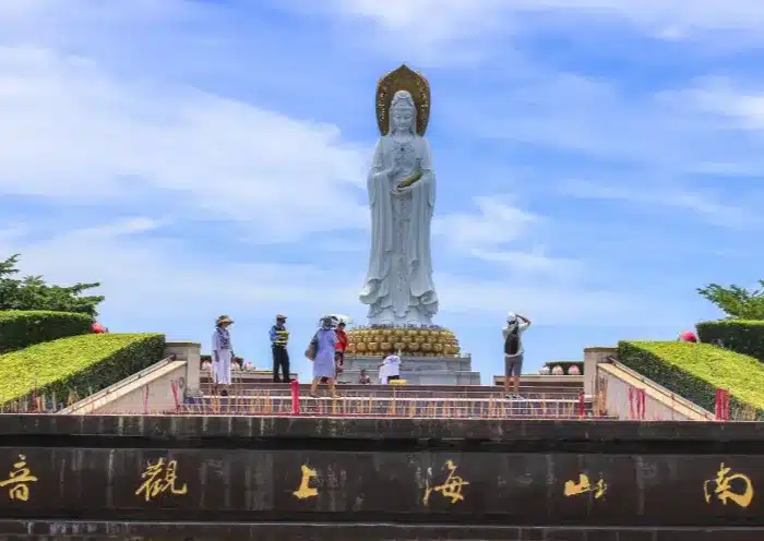 It is a Buddhist holy site with the 108-meterĀ Guanyin statueĀ as its core symbol. TheĀ three faced Guanyin statue stands tall on the South China Sea, holding a bamboo Buddhist scripture, a string of beads, and a lotus,Ā which correspond to wisdom, compassion, and peaceĀ respectively. You can climb from the inside to the lotus pedestal, hug Guanyinās feet and pray for blessings. Another highlight of Nanshan Temple is the 33 statues of different forms of Guanyin.
