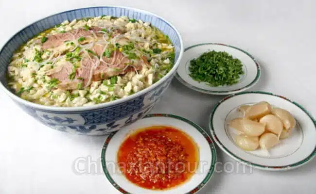 The Crumbled Flatbread in Mutton Stew (known in Chinese as “Yangrou Paomo”) is a kind of traditional cuisine originated in Shaanxi Province, with Xi’an Paomo being the most famous. Like many other local dishes, restaurants serving Mutton Paomo can be found here and there in Xi’an, including a lot of time-honored brands like Lao Sun Jia, Tong Sheng Xiang and Lao Mi Jia. Recognized as the most representative meal of Xi’an, nearly all the visitors will put Yangrou Paomo on their must-eat list during their Xi’an tours.
